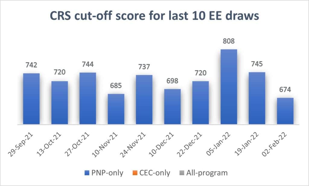 Immigration, Refugees and Citizenship Canada (IRCC) only invited Provincial Nominee Program (PNP) candidates. The Comprehensive Ranking System (CRS) score requirement was 674. PNP candidates get an automatic 600 points added to their score when they receive their nomination, which is why the score is significantly higher than a typical all-program draw. Without the nomination, the lowest-scoring candidate would have needed just 74 base CRS points.