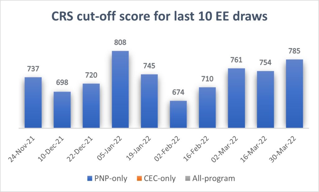 Immigration, Refugees and Citizenship Canada (IRCC) only invited Provincial Nominee Program (PNP) candidates in the new invitation round. To be invited, candidates needed to have a Comprehensive Ranking System (CRS) of at least 785. The minimum score was relatively high because PNP candidates get an automatic 600 points added to their score when they receive their nomination. Without the nomination, the lowest-scoring candidates would have had 185 base points.