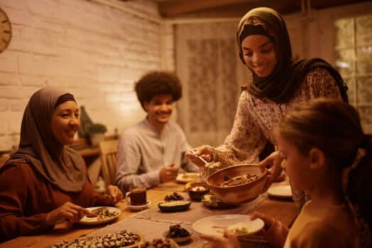 Ramadan ends with Eid ul-Fitr. Typically, the day starts by putting on brand-new clothes and going to the mosque for prayers. The rest of Eid is devoted to good food and visiting friends and family. Households will have sweets like mithai, dates or baklava, depending on their traditions, to entertain guests throughout the day.