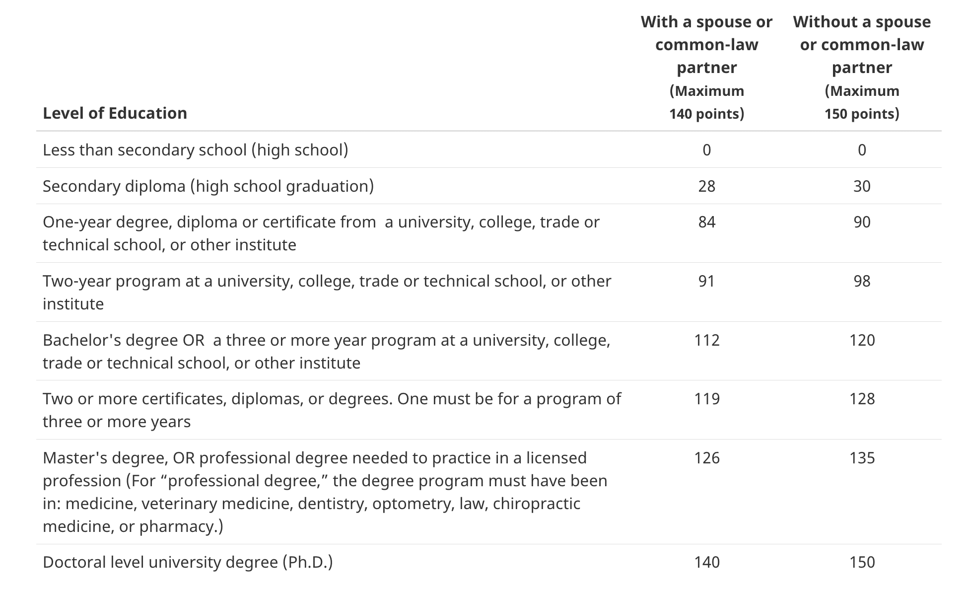 For example, under the CRS scoring grid above, we can see that having “two or more certificates, diplomas, or degrees (with one being from a program of three or more years in length) can earn up to 128 points for single applicants. This is an additional 8 points within the CRS when compared to someone with only a bachelor’s or three-year degree; which can mean the difference between receiving an ITA and not being invited in an Express Entry draw.