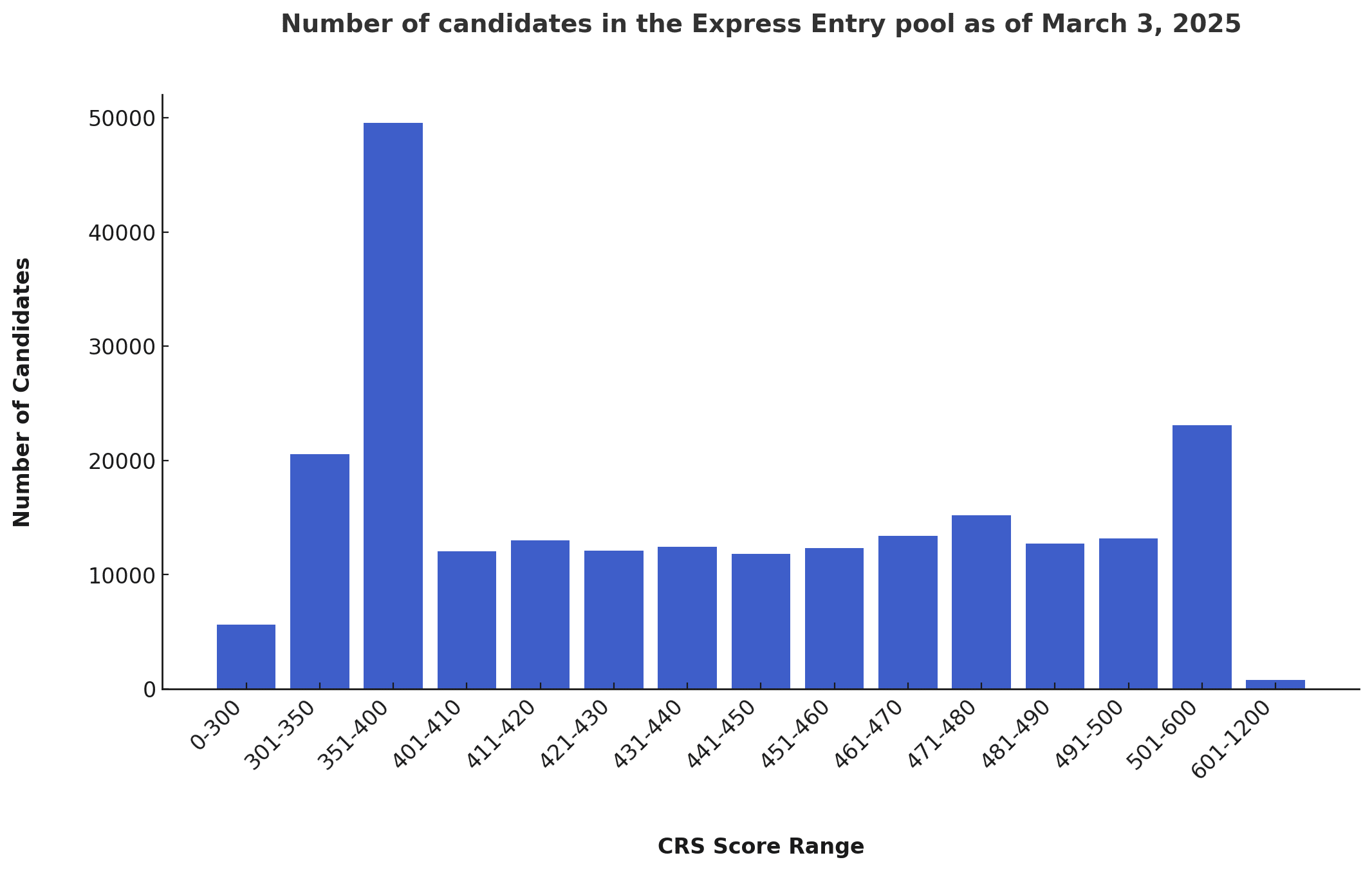 The below table details the current distribution of scores within the Express Entry pool (as of March 3, 2025), as well as the percentile ranges of the individual scores at each score boundary. In addition, the proportion of candidates in each score boundary relative to the overall candidate pool has also been included.