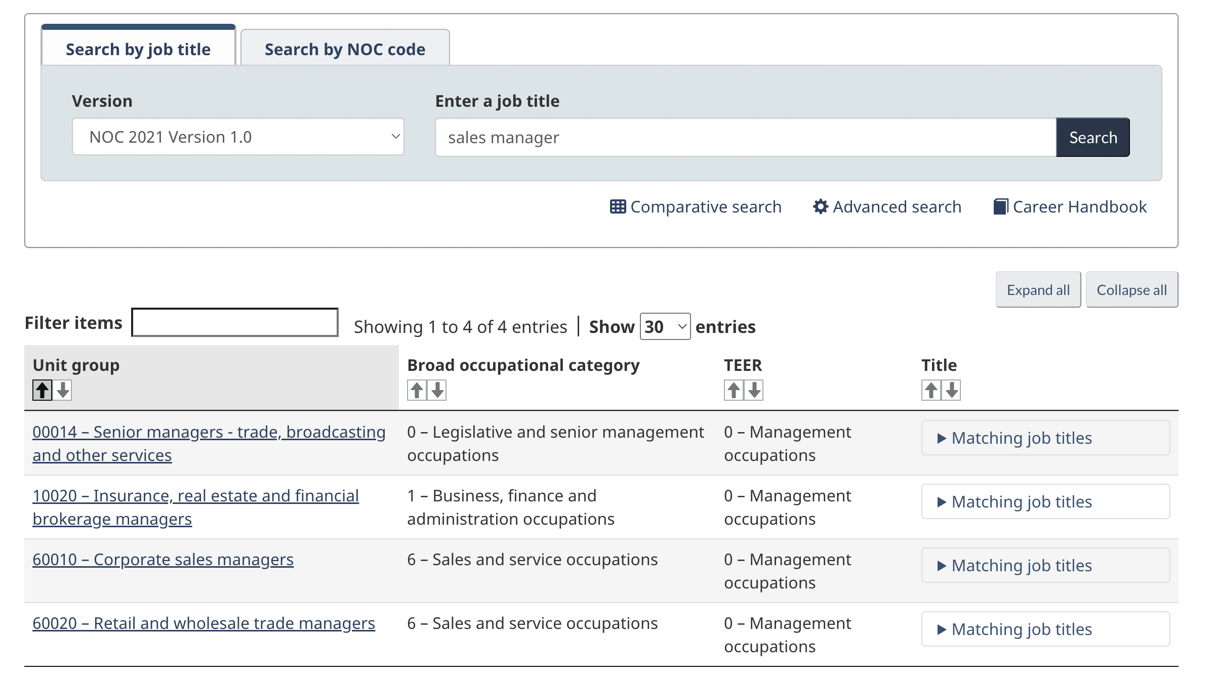 You can then use the NOC website to search for your job title. Once you enter a specific title, you will be directed to the search page, which shows all jobs under the NOC system that can use this title.