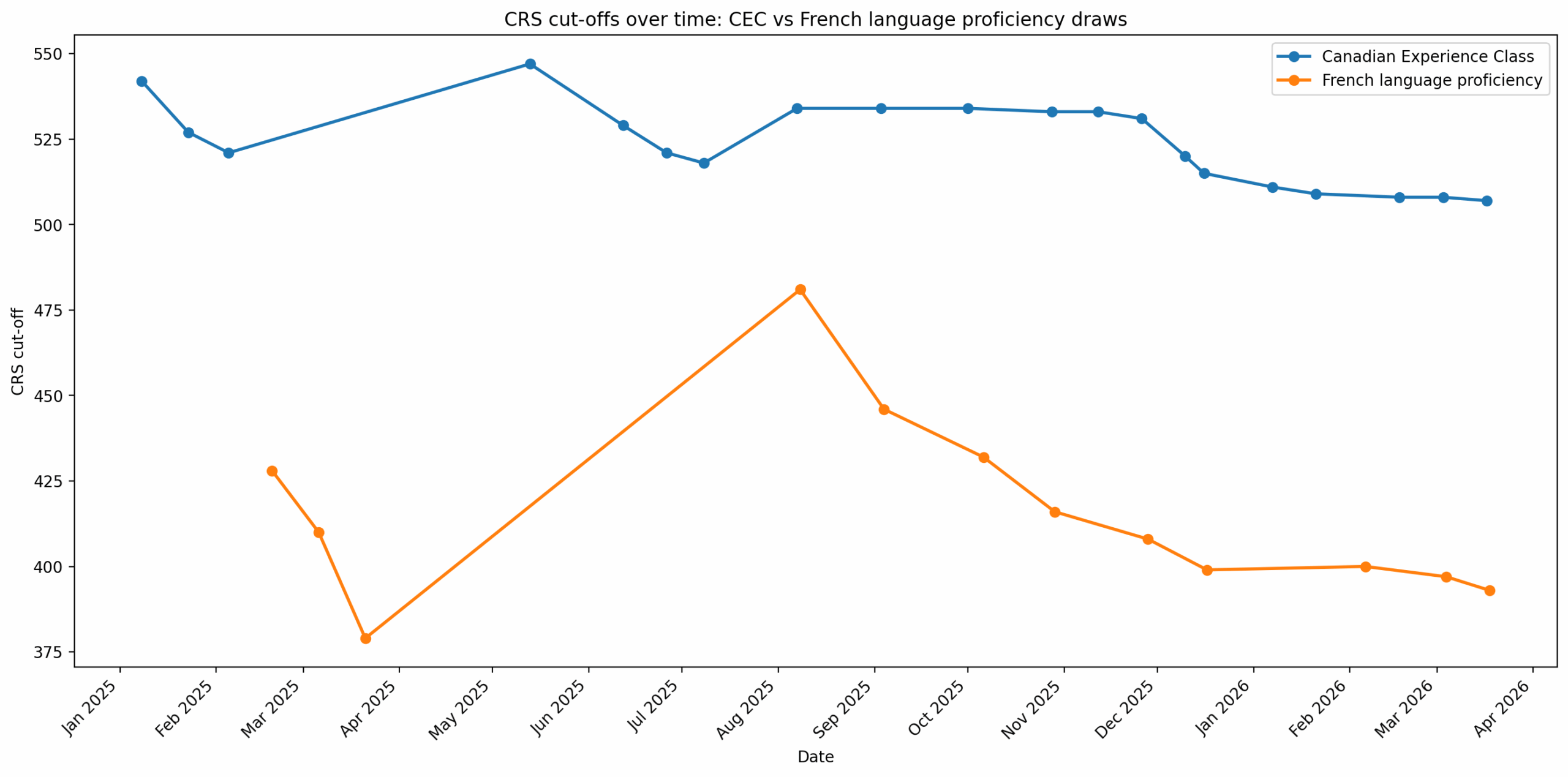 CEC and French draws have consistently invited large numbers of candidates through their draws, contributing to falling CRS cut-off scores for both draw types: